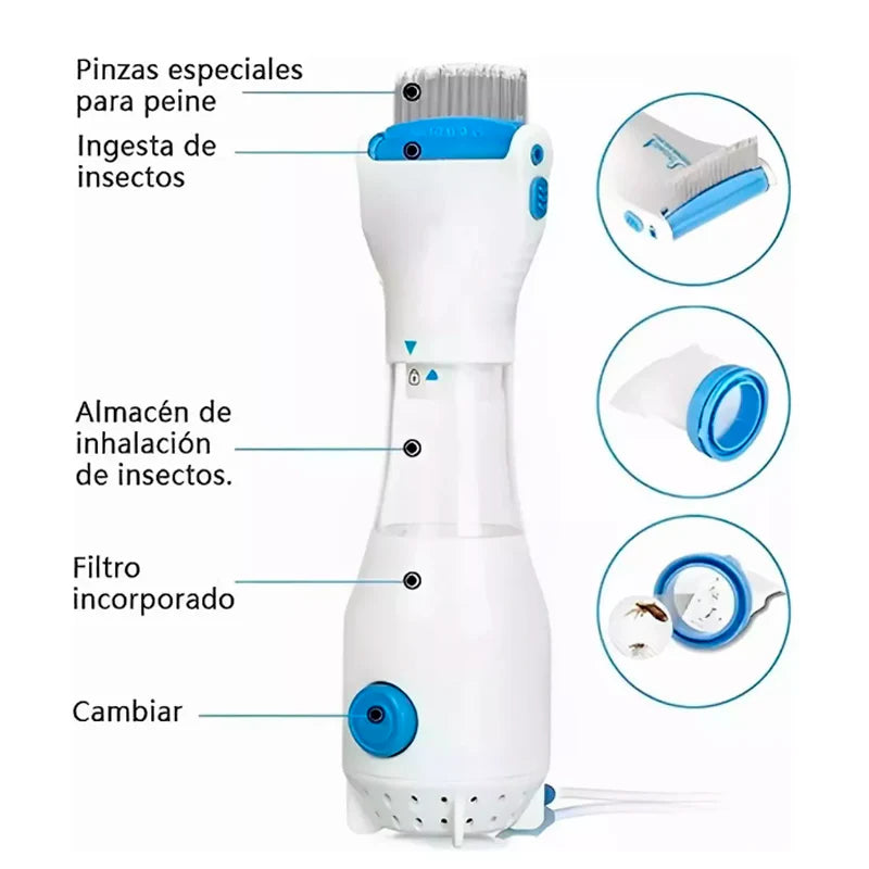 Peina y aspira al mismo tiempo, eliminando piojos y liendres sin esfuerzo.
