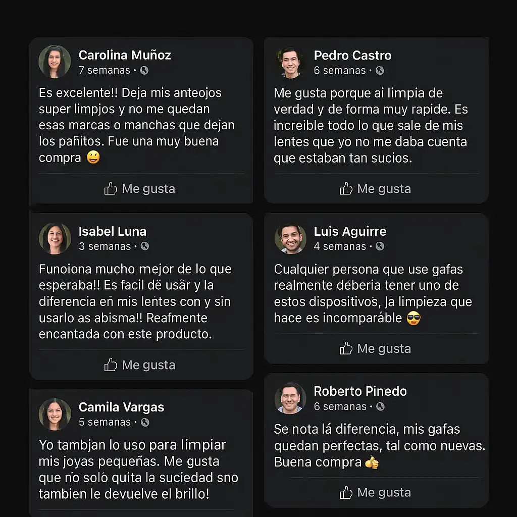 Si limpiar tus gafas siempre deja manchas y marcas molestas que generan fatiga visual y opacan tu vista, UltraCleaner Pro™ es la solución: con ondas ultrasónicas elimina suciedad, grasa y mugre, incluso en los rincones donde el paño no llega.
